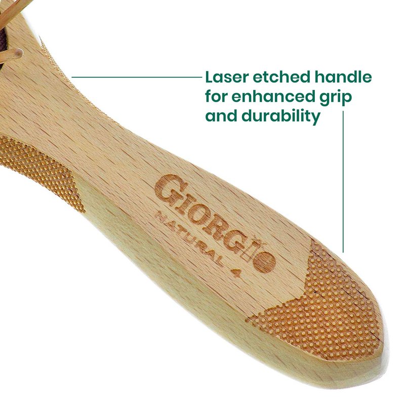 About Giorgio Naturals: Sustainably made from ultra-light, durable, and all-natural beechwood, laser engraved for enhanced grip. The beechwood bristles allow for a gentle, anti-static, detangling experience, eliminating any pulling or hair breakage. The air-cushioned base ensures a comfortable glide while stimulating the scalp and spreading natural oils. Suitable for all hair types, lengths, and textures. Brush Care - To remove excess hair, comb thoroughly with a hairbrush cleaner. About Giorgio: We are a family run company, with the vision of developing beauty products for all audiences in a responsible and sustainable fashion. We’ve avoided harmful heavy metals and nylon products in order to produce quality products out of wood and cellulose acetate – safe for the consumer, eco-friendly and sustainable trusted materials. Our “eco brush” and customer-first attitude has led us to constantly try and improve our product and brand, eventually developing our magnum opus, the Giorgio Naturals collection. This collection is at its core a vegan brush; made entirely of wood with a silicon cushion it is a plastic free extremely durable product. They best embody our eco friendly hair brush design, with an ergonomic grip, wood bristles, and wooden paddles.