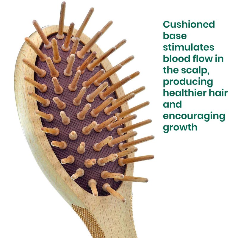 - WOODEN BRISTLES: Unlike nylon or boar bristles, wood bristles are hypoallergenic, produce no ionic static charge, and grasp the hair’s natural oils and spread these evenly throughout the hair, keeping it shiny and smooth while adding sheen and luster.