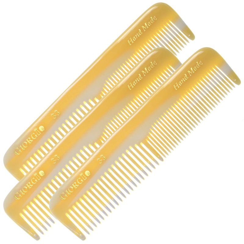 Giorgio G33 Pocket Comb G33 Flexible Comb 4.5 Inch Coarse / Fine Toothed, Imitation Horn. Flexible women and men Hair, Beard & Mustache Pocket Comb. Hand-Made of quality Durable Cellulose, Saw cut and Hand Polished for ultimate and effortless smooth glide. Prevent Pulling and hair breakage. Rounded tips for sensitive scalps and release of hair's natural oils. Hand Made of quality Cellulose , a non-petroleum base material, that’s why they have minimal static.Smooth, rounded teeth for sensitive skin stimulating the hair cuticle’s and release of hair's natural oils for a hair strong and healthy. Anti-static. A women and men favorite comb for both hair and quick beard and mustache care. Easier to clean than wood. Unlike beard brushes, combs for beard and moustache are best used on damp hair. Ease to clean with shampoo under the tap.