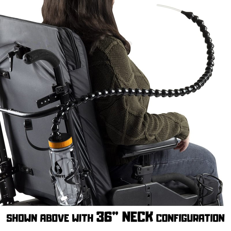 The Giraffe Bottle Hands Free Drinking Bottle allows users with various abilities to stay hydrated. Designed by Oak Hill Brands, with an extensive history in the Assistive Technology field, the system is designed to be adaptive to the user, flexible, and easy to use. The solution is great for desks, wheelchairs, beds, tables, and more. The included bottle holder is designed to hold your Giraffe Bottle (and other bottles) securely. Since the bottle holder is aluminium it can be adjusted to hold larger bottles. In addition, clamp is adjustable and rotates to attach to both horizontal and vertical round tubing. Each Giraffe Bottle comes with a 750ml/25oz Tritan bottle, lid with polypropylene seal, cap, flexible neck, drinking tube, check valve (to prevent liquid from flowing back into the bottle), and a stainless steel nylon-tipped cleaning brush. Every component is FDA compliant.