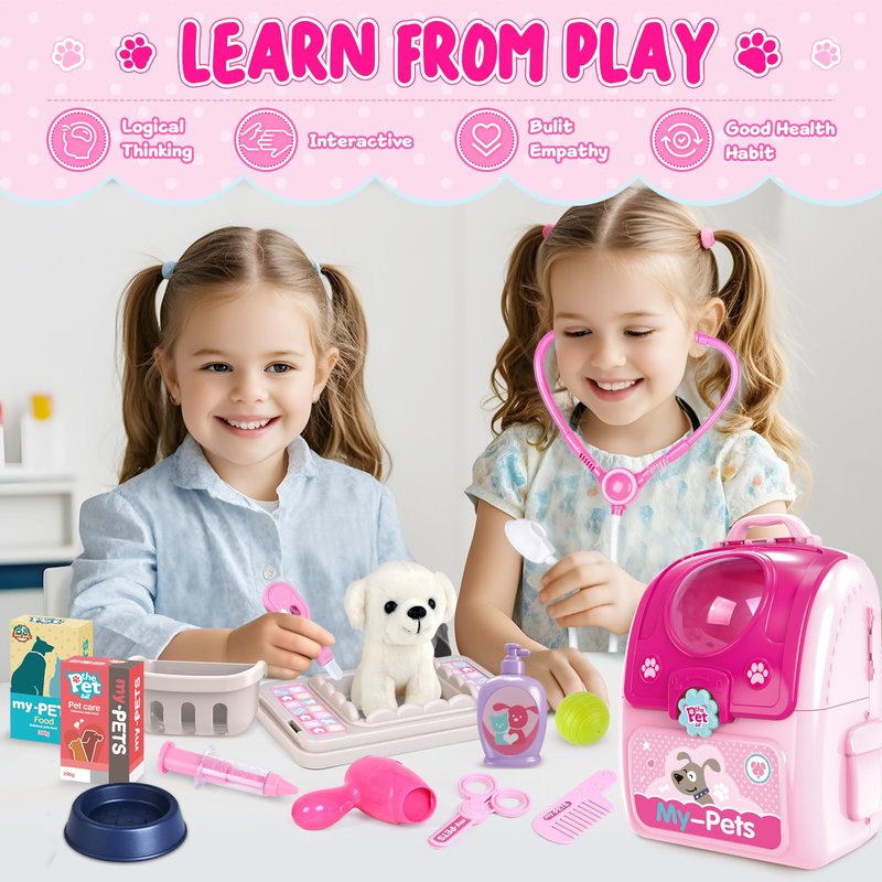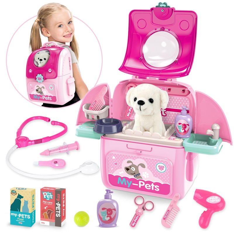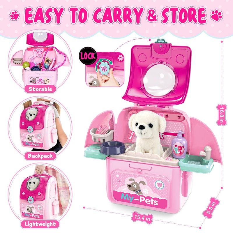 - 【Easy Carrier and Storage】The design of the pretend play pet vet kit for kids is a really nice touch. The included pet case can be used as both a storage space and a play environment. All the pet care toys can be stored neatly away in the backpack, and when you play again, you can pull them out quickly to play without having to search for all the accessories. What's more, it can be used as a backpack that comes with adjustable straps for children of different heights, easy to carry and perfect for on-the-go playdates or travel.