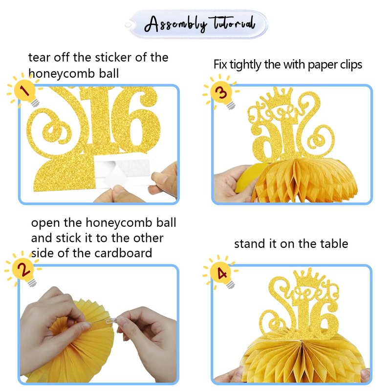 - What You Will Get: The package contains 8 pack gold Sweet 16 Honeycomb Centerpieces decorations, including 8 pieces of cardboard and 8 sets of paper honeycomb balls.