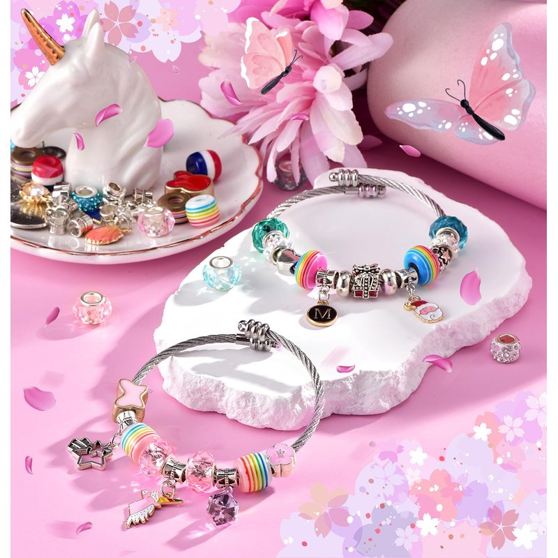 - Toy ideal for girls aged 6 to 12. In addition to being a fun toy, this charm bracelet making kit serves as an educational toy that can stimulate your girl’s creativity, imagination, and self-expression. The included different sparkling charms allow her to mix and match to create unique designs. Simple to Use, unscrew to remove the end cap, After stringing in the charms, simply screw back the end cap tightly.