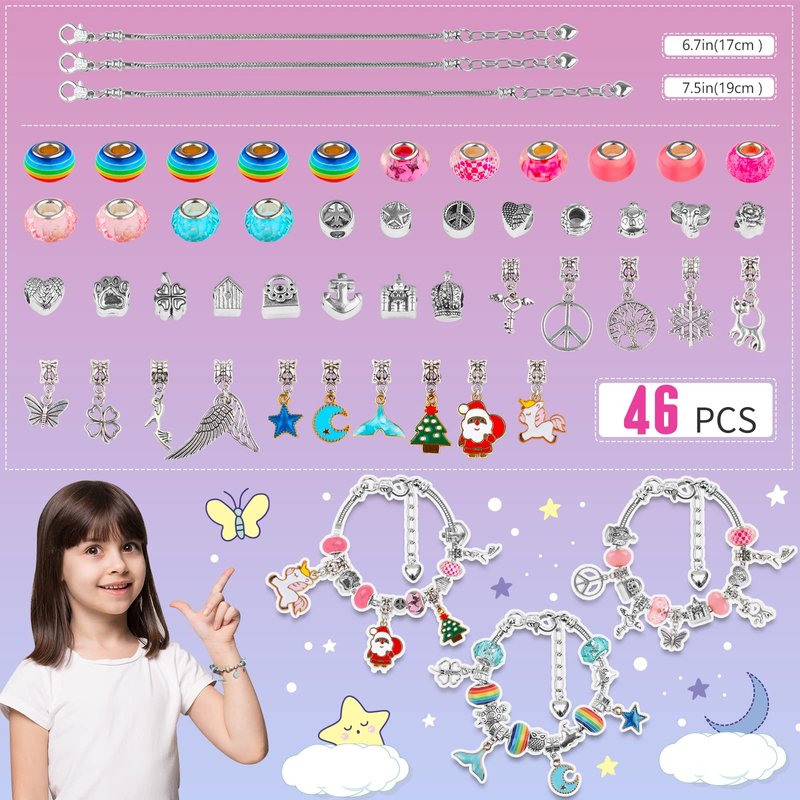 - Unicorn Toys for Girls Magic: The unicorn charm bracelet jewelry kit has everything your child needs to create multiple eye-catching charm bracelets. The DIY bracelet-making kit for girls has 16 metal beads & 15 charms & 15 colorful beads, girls will be surprised to find charms with unicorns, angel wings, Santa Claus, and more. Together with the lovely unicorn hairpin and delicate stickers, Kids' bracelets Definitely a surprise gift package for the 2024 Children's Day gift.