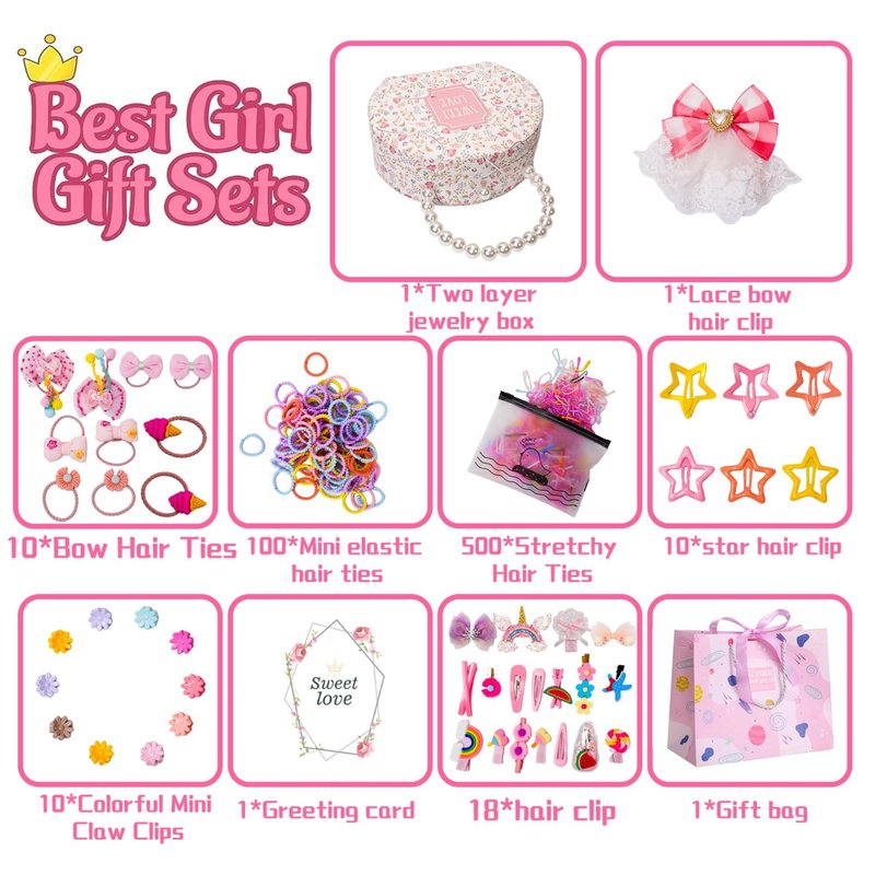 Girls Jewelry Set with Hair Accessories: Clips, Barrettes, Ties, Bows, and Round Jewelry Box - Christmas Gift for Ages 4-10