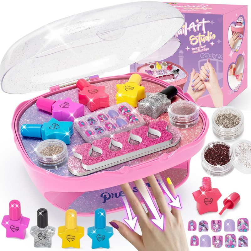 - Safe & Peelable Nail Polish: The girls nail polish set has 5 colors of water based nail polishes, safe for kids. The washable nail polish could be easily peeled off of nails for girls, protecting tender skin and nails for kids. Your little girl can enjoy a safe, comfortable nail salon experience. Our manicure kit help your girls undertake their design journey happily, boldly unleash her imagination. Amazing toys for girls 8-10 to have a kids spa party.