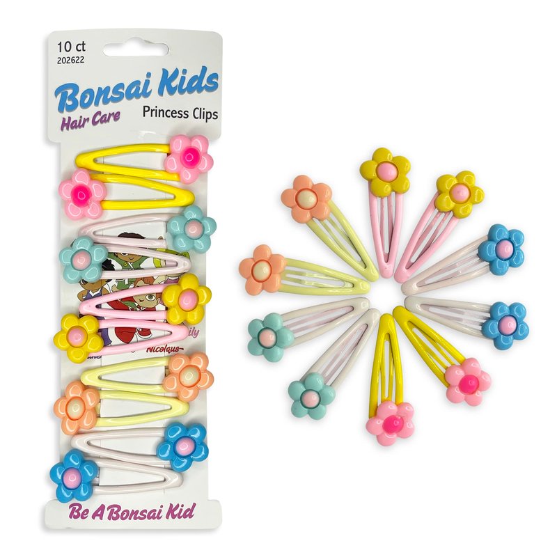 Bonsai Kids Princess Clips With Flowers: Add some beautiful colored flower clips to their hairstyle. Pink, Green, Yellow, Orange, and Blue are essential for every girl's hair accessories collection. There are endless style ideas for keeping their hair securely with the Princess clips.