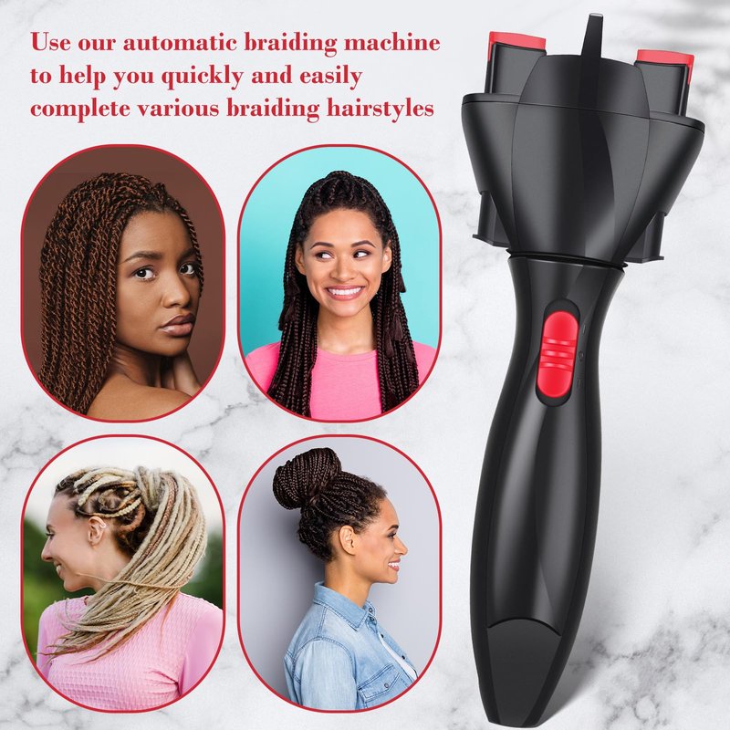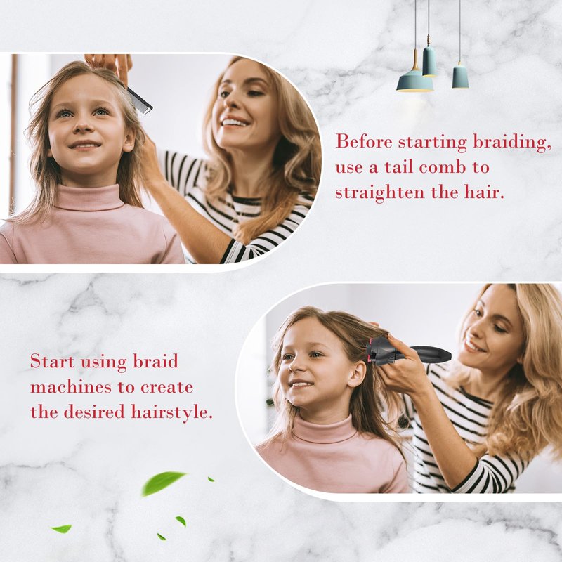- Simple Steps: first, pick out two strands of hair into the top of the hair braider, release the clip button to hold the hair and then, turn on the switch in the middle of the hair braider, the braid began to start rotating the braid until the hair is twisted to the root of the hair, turn off the switch to remove the braider and finally, use the leather band or bobby pins will be braided and tied up; Finish braiding