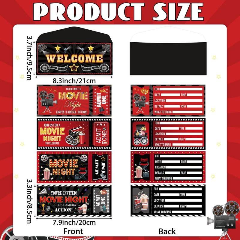 - Proper size: The movie popcorn party favors are approximately 3.4 x 7.9inches/8.5 x 20cm and feature a double-sided design, offering ample space on the back for your party details. The envelopes measure about 3.7 x 8.3inches/9.5 x 21cm, providing a ideal fit for the invitations.