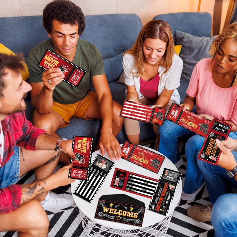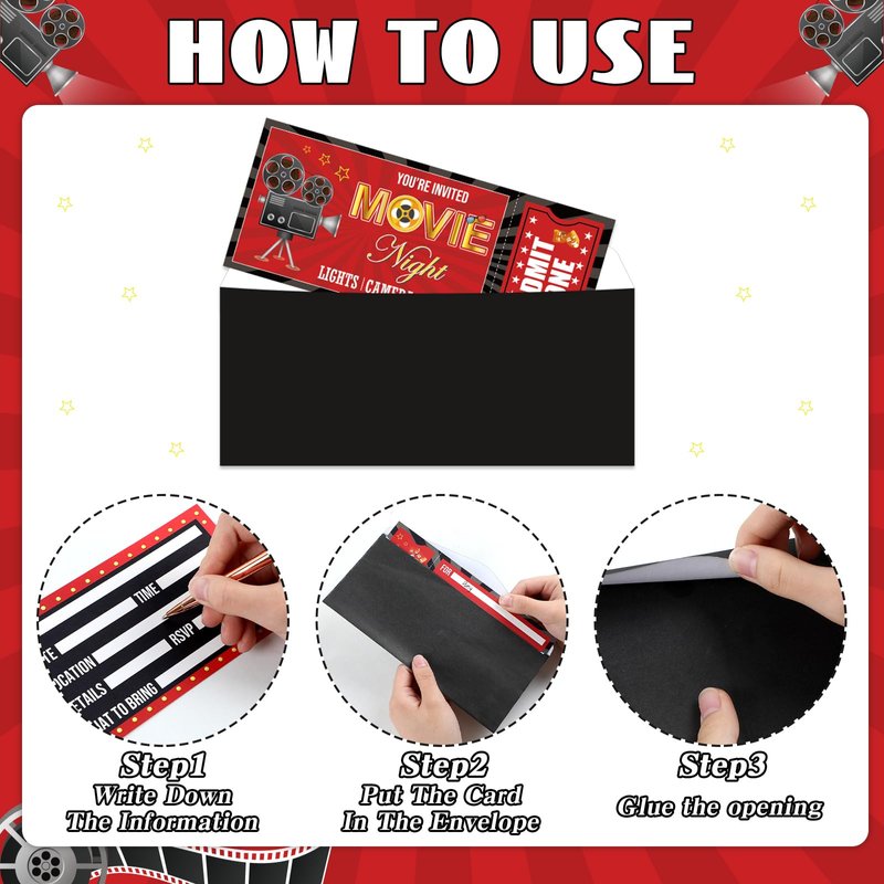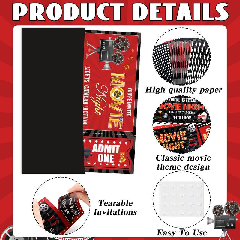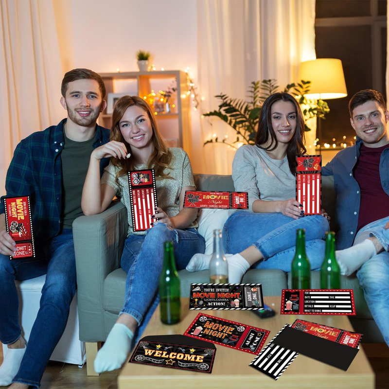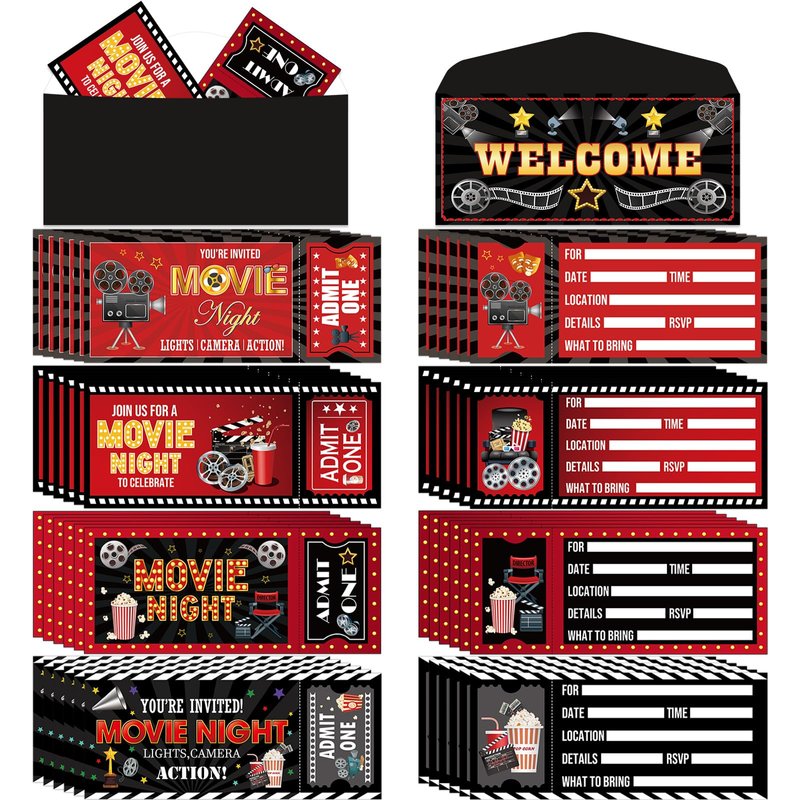 - Package includes: You’ll get 40pcs of movie night party invitation cards, 40pcs of movie night envelopes, and 3 sheets of adhesive dots. With this comprehensive package, you'll have everything you need to send out your invitations quickly and effortlessly.