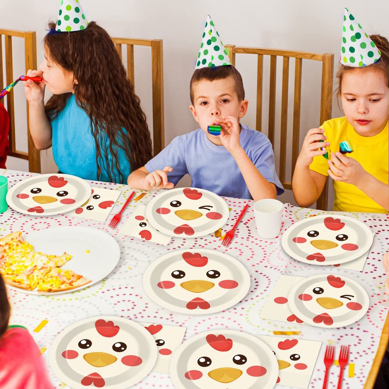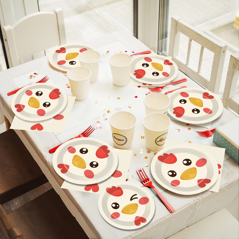 - 【Chicken Party Design】 The chicken tableware kit is perfect for any type of celebration. The bright colors and chicken pattern will make your party stand out and bring a cheerful atmosphere to your guests. Decorating your chicken party with this tableware kit will make your event fun and memorable.