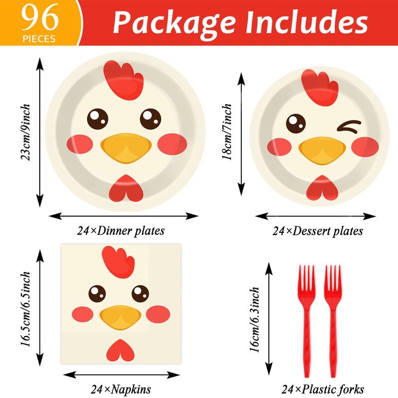 - 【Package Includes】You will receive 24 pieces chicken themed party paper dinner plates of 9’’, 24 pieces dessert plates of 7’’, 24 pieces chicken party napkins of 6.5’’ and 24 plastic red forks for each set that can serve 24 guests.