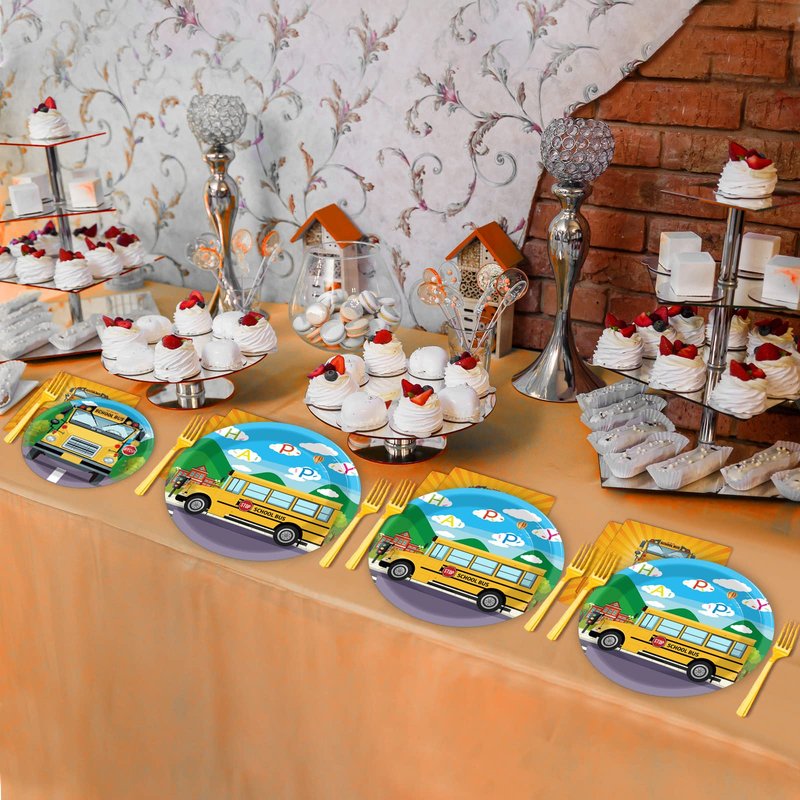 - 【Back to School Table Settings】These back to school party tableware kit can serve 24 guests, an enough quantity for a normal school bus theme big day. These school bus party decoration kit will make your table settings look fantastic and all your guests will be happy.
