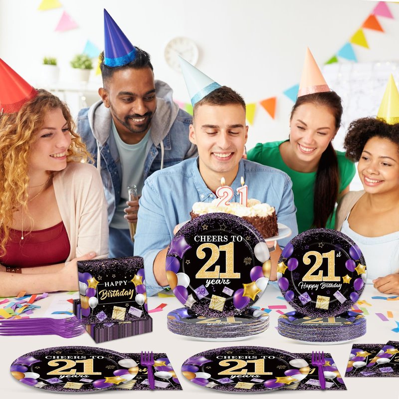 - Save your time: This disposable "Cheers to 21 Years" purple and black tableware set is ideal for birthday party decorations and can be easily discarded after use, saving you from the hassle of washing dishes. When the party ends, you'll have more time to enjoy with family and friends and less time spent on cleanup.