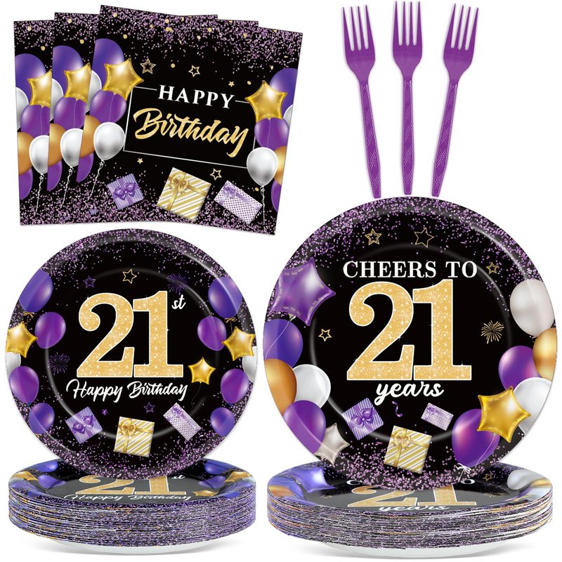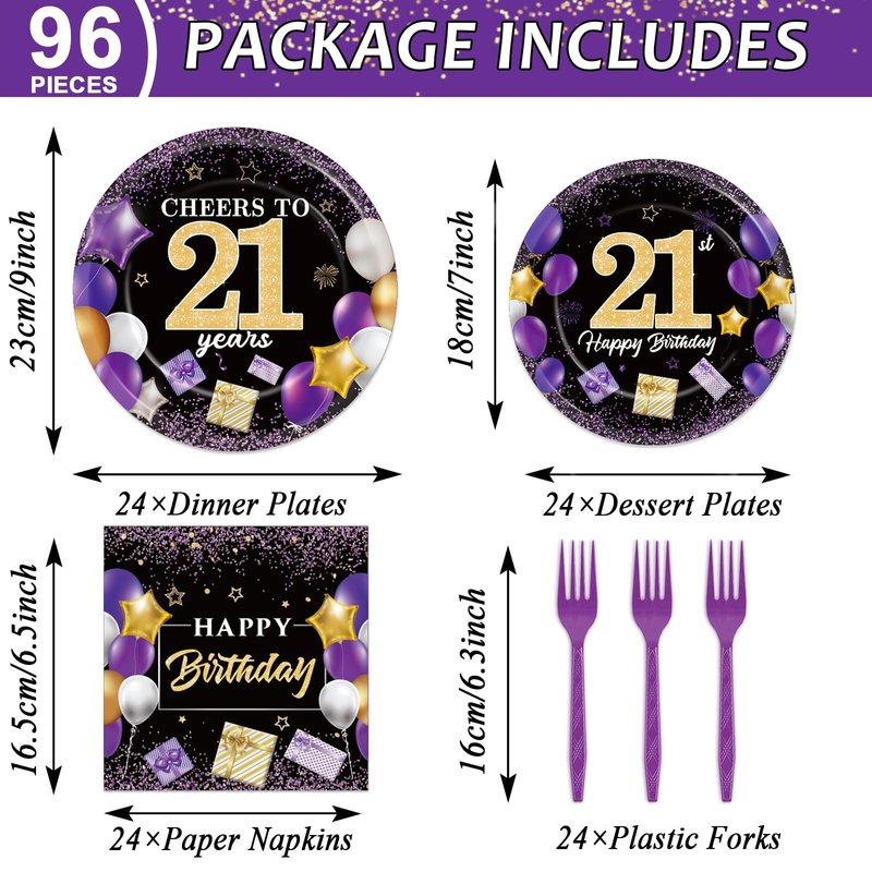 - 96PCS purple 21st birthday party supplies: You'll get 24 pieces of purple black party paper dinner plates 9in, 24 pieces Cheers to 21 Years dessert plates of 7in, 24 pieces of purple 21st birthday napkins 6.5in, and 24 pieces of plastic purple forks for each set that can serve 24 guests.