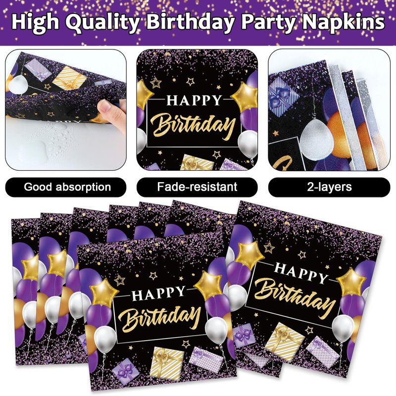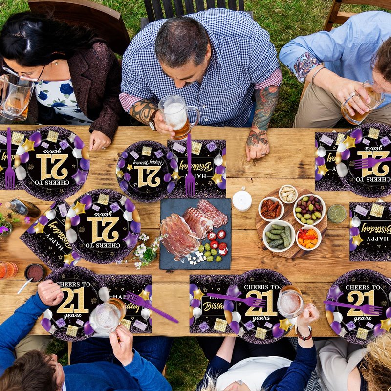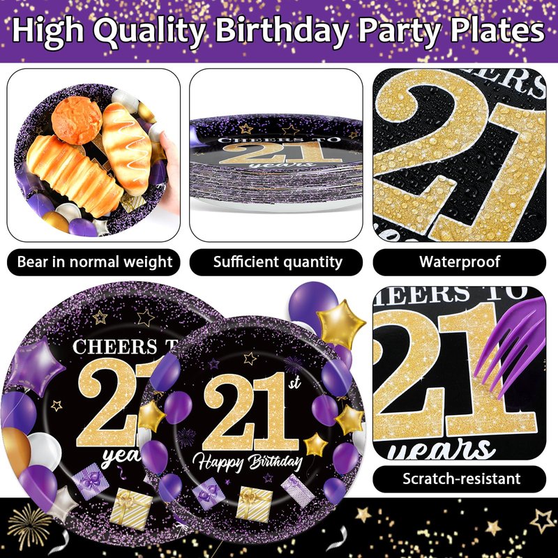 - Premium material: Our purple and black party decorations are printed with high-quality, premium water-based ink. These 21st birthday party plates are made from thick, film-laminated cardboard, ensuring they are durable and capable of holding more food. Additionally, the "Cheers to 21 Years" birthday party paper napkins are soft and highly absorbent.