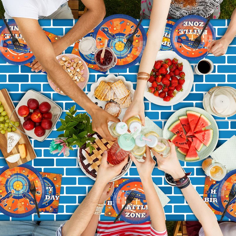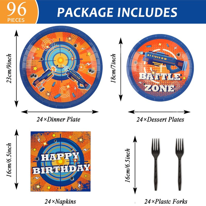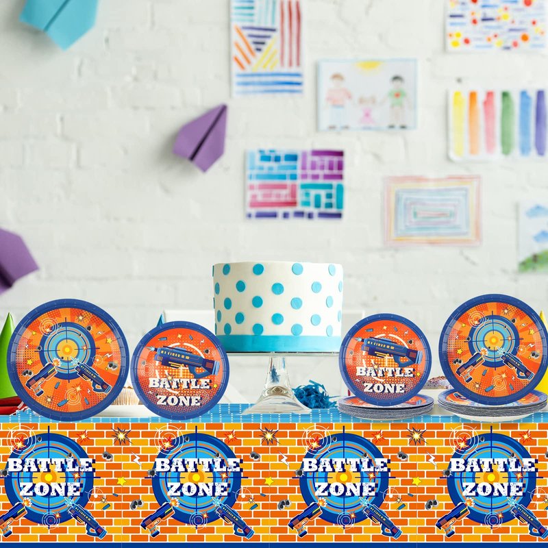 - 【Package Include】This dart war birthday party supplies set includes: 24 plates (9inch) + 24 plates (7inch) + 24 napkins (13inch) + 24 forks + 2 tablecloths (274 x 137cm/108 x 54 inches). There are a total of 98 pieces in this set, which will add fun to any dart war theme birthday party.
