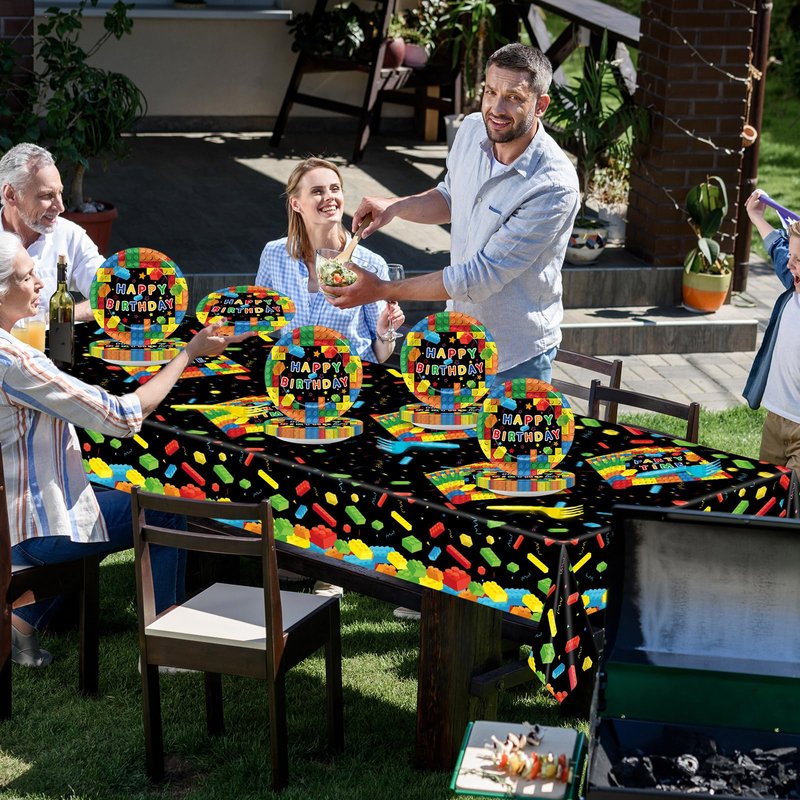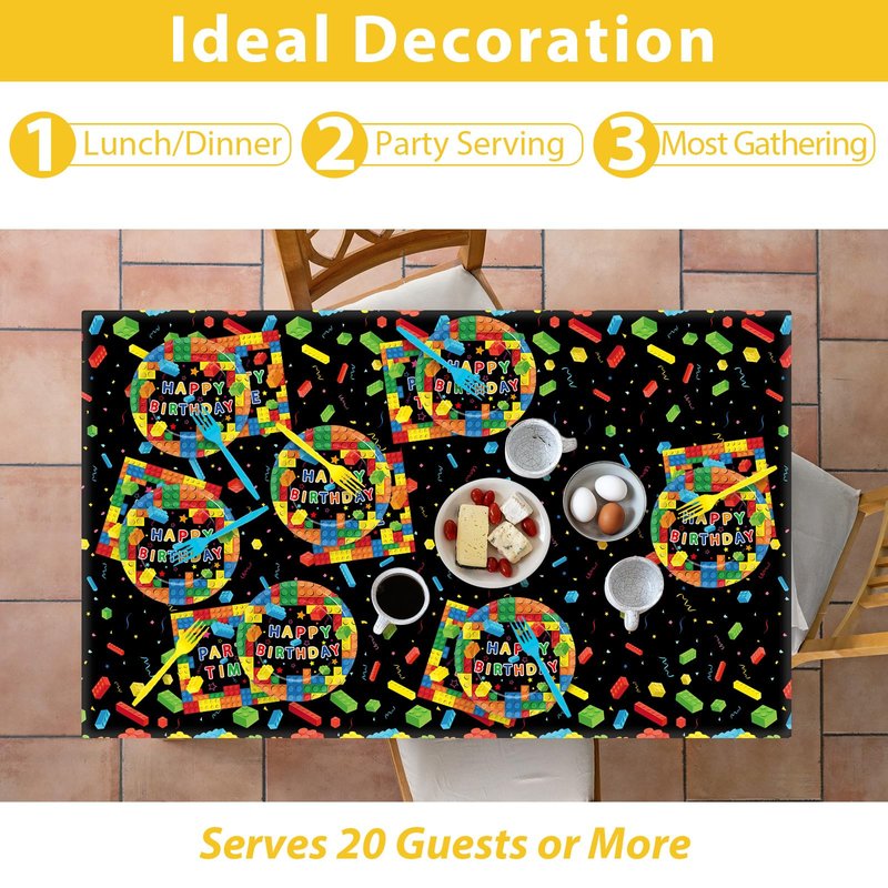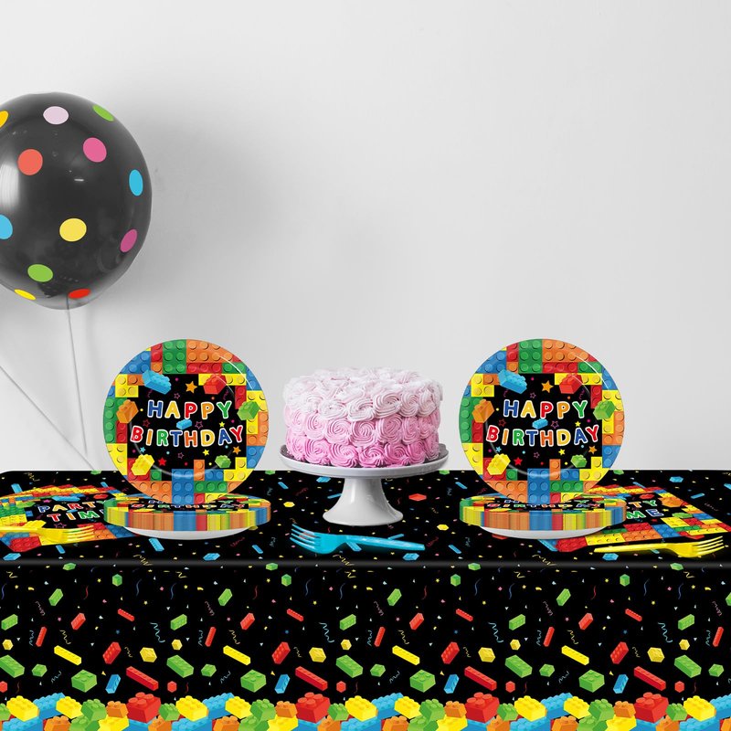 - Package includes: Building blocks party supplies include 20pcs of 7-inch building blocks party dinner plates, 20pcs of forks, 20pcs of colorful blocks party napkins, 1pc of building blocks party tablecloth, providing everything you need to set the stage for a memorable and fun-filled celebration.