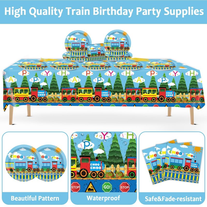 - 【Easy to Use and Save Time】Enjoy your party and save time with our train Party Set. After the party is over, simply dispose of the plates, napkins, and tablecloth, and spend more time with your family and friends instead of cleaning up. That's why we designed this Train Birthday Party Set.