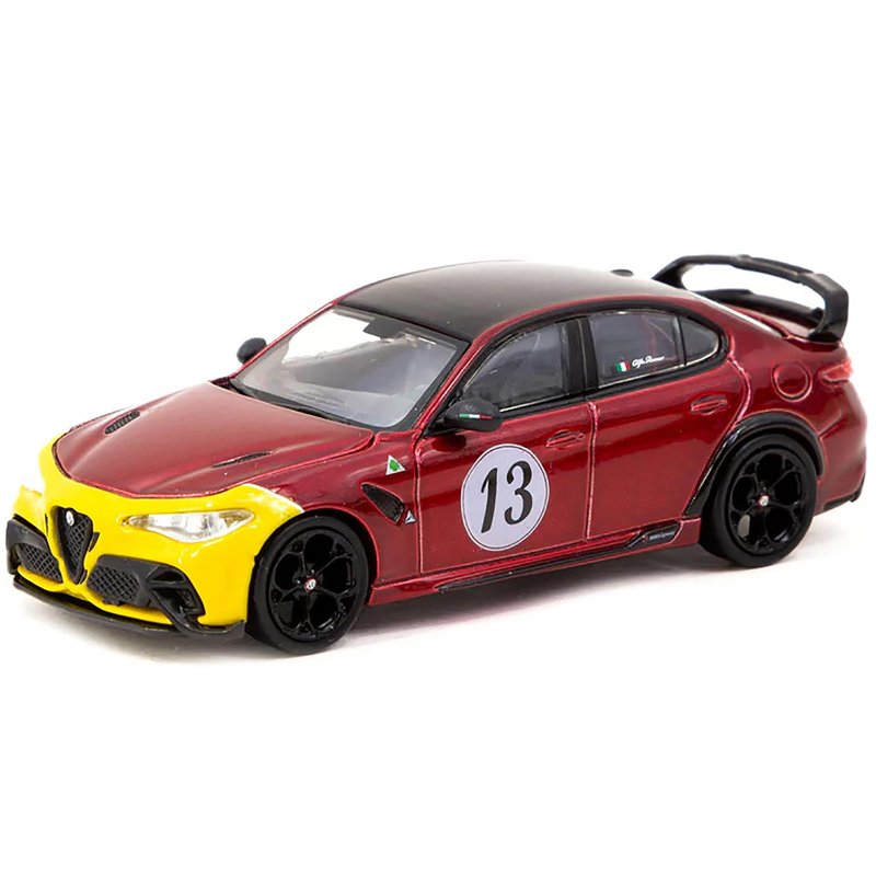 Brand new 1/64 scale diecast model of Giulia GTAm #13 Red Metallic and Yellow with Black Top "Global64" Series die cast model by Tarmac Works T64G-TL031-MRY