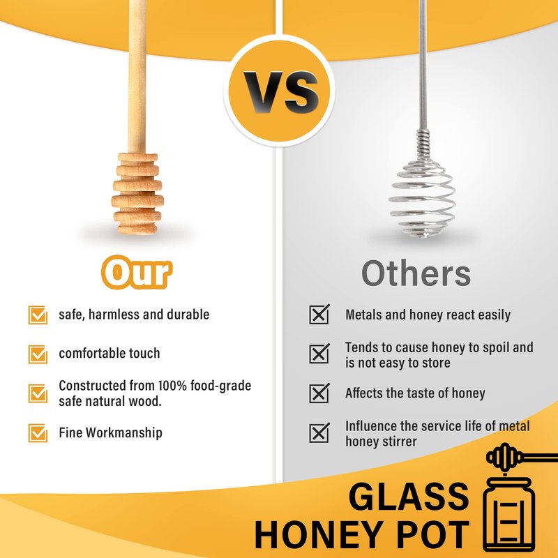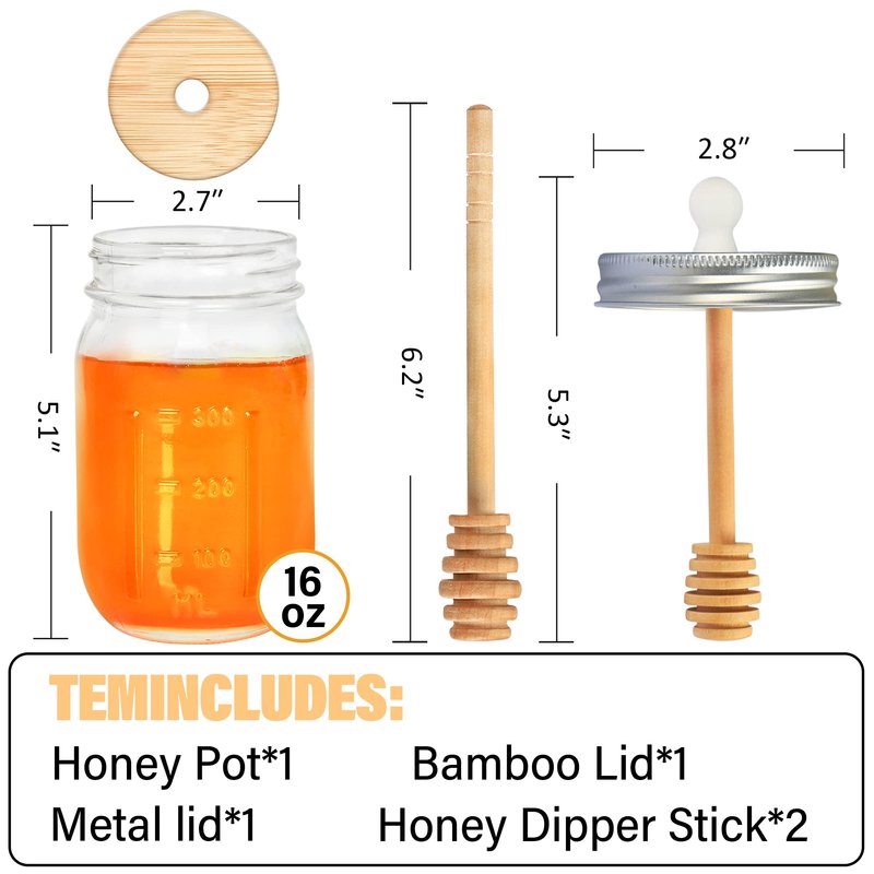 - 🍯【Safe and Reliable Material】This 16oz honey pot made of high-quality thick glass which are stronger and more durable.Wooden honey dipper lid is made of 100% natural wood-Extra mason covers and wooden honey dipper stick for replacement
