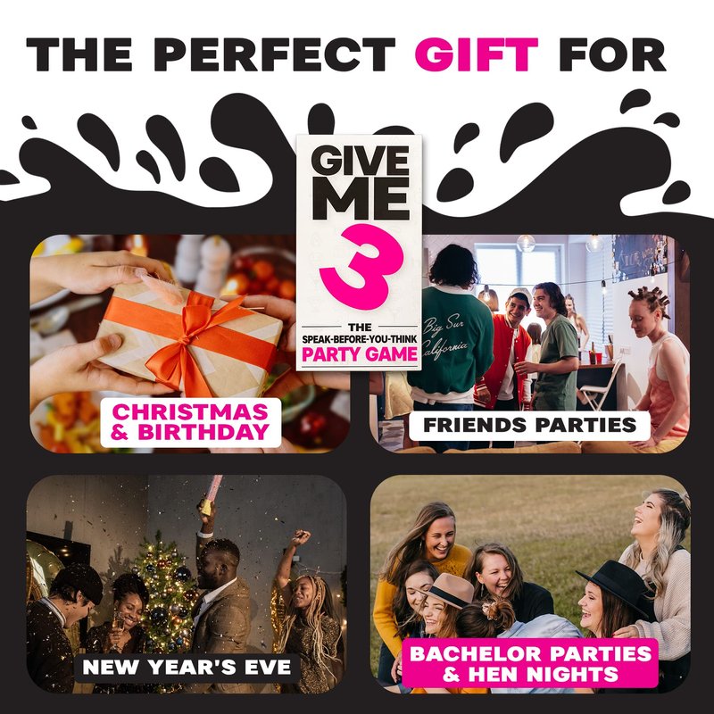 - β€οΈβπ₯ JOIN THE GIVE ME 3 PHENOMENON - OVER 1,000,000 PLAYERS WORLDWIDE! Get your copy today and be part of the laughter and fun. Don't miss out on the ultimate party game experience