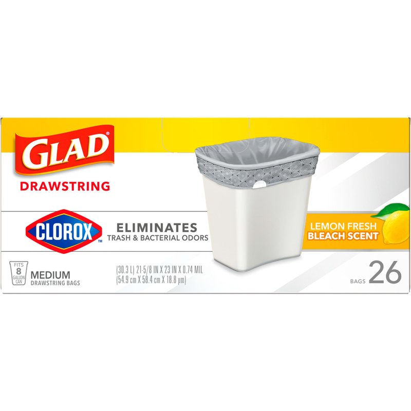 Glad Medium Drawstring Trash Bags with Clorox, 8 Gal, Lemon Fresh Bleach, 26 Ct (Package May Vary)