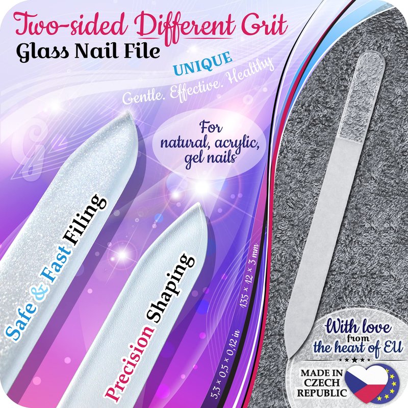 - Genuine Czech Glass Nail File - Gladzy Beauty nail file for natural nails all types (sensitive, thin, etc.). Our crystal nail file, also known as a Bohemian glass nail file, is perfect for regular use to maintain strong, healthy nails. The unique 3mm thick design stands out with its double-sided different grit surfaces, offering an unparalleled experience of fast filing and precision finishing.