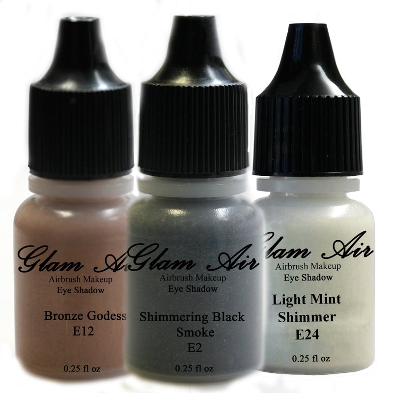 Glamair Set Of Three Shades Of Airbrush Eye Shadow Makeup E2 Shimmering Black Smoke E12 Bronze Godess And E24 Light Mint Shimmer Water-Based Formula Last All Day 0.25Oz Bottles
