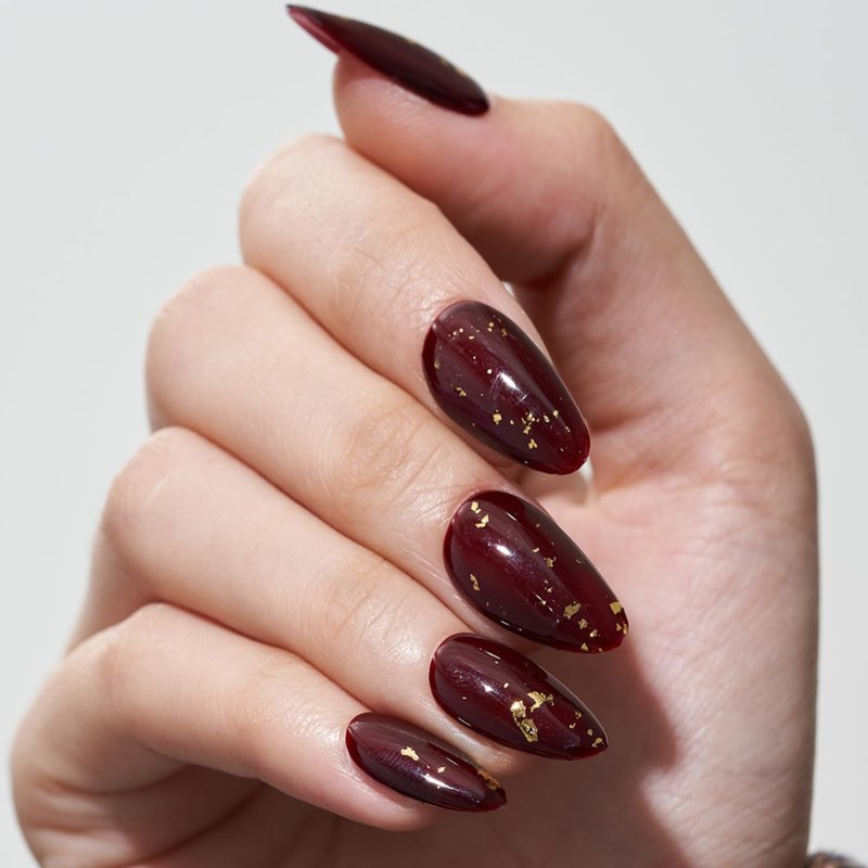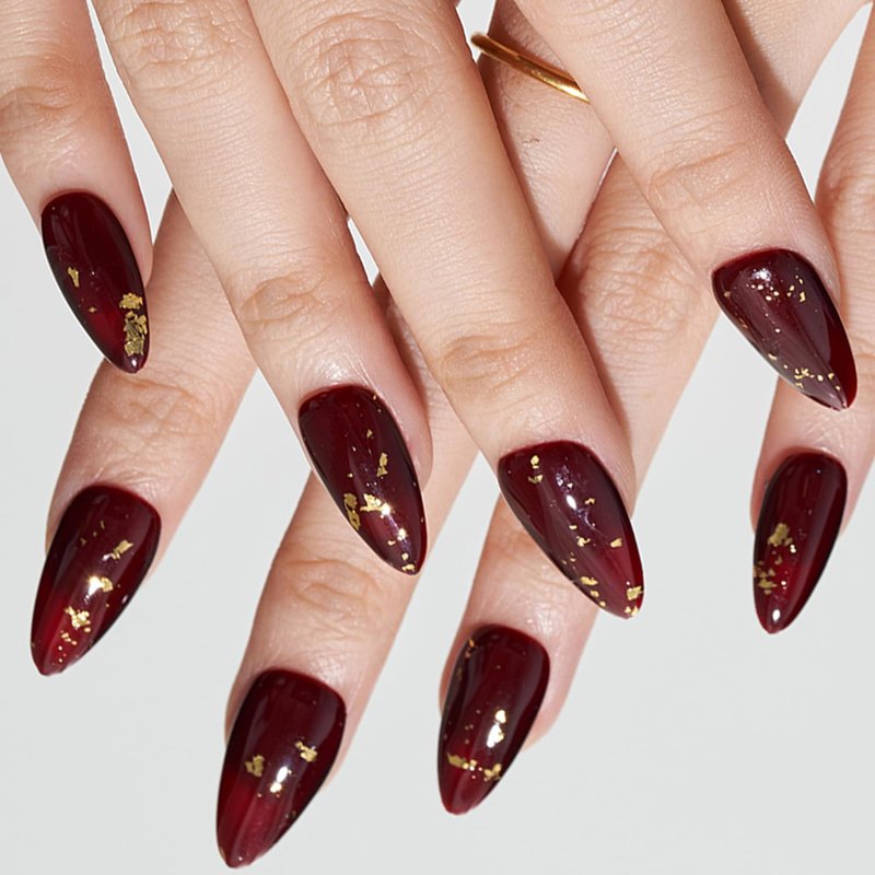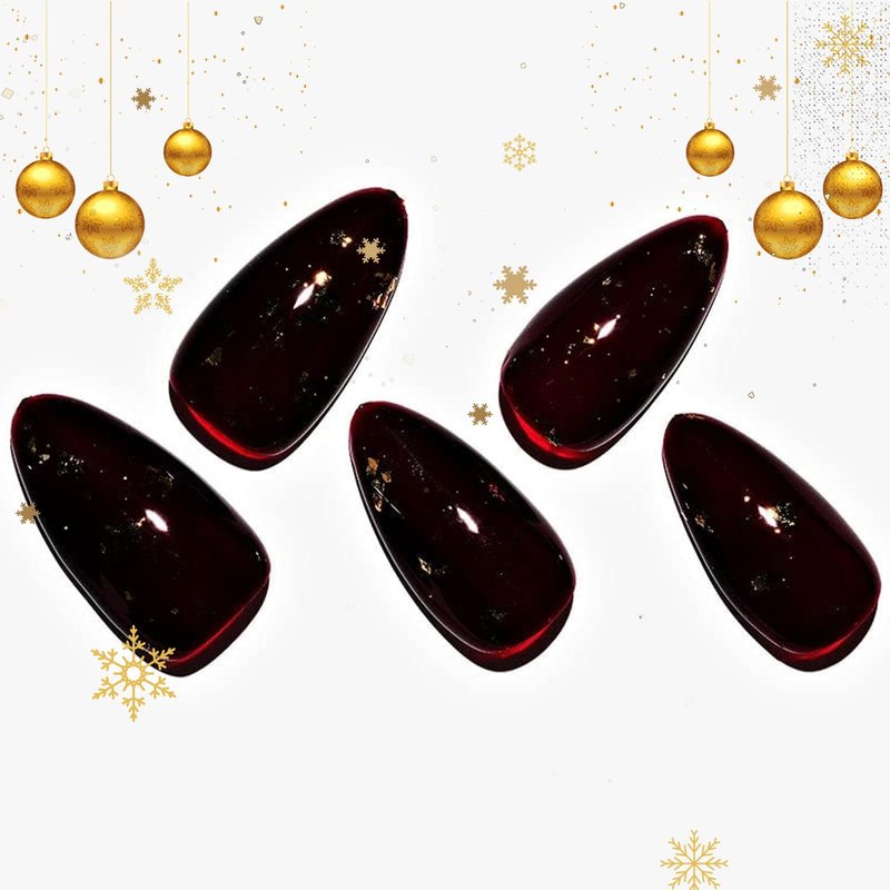 GLAMERMAID Burgundy Press on Nails Medium Almond- Handmade Jelly Gel Gold Foil Flakes Fake Nails Short, Deep Dark Red Stiletto Stick Glue on Nails Set, Glossy Reusable Acrylic False Nail Kit for Women