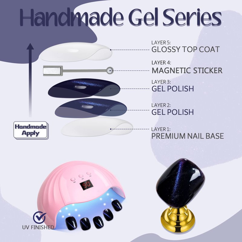 - Handmade gel series nails: GLAMERMAID handmade gel press on nails series not done by machine printing, but by the manicurist's hand applied gel polish layer by layer, "jelly" high shine finish that looks like salon quality are durable, flexible, and easy to apply. You get an added texture that makes this manicure stand out from the crowd