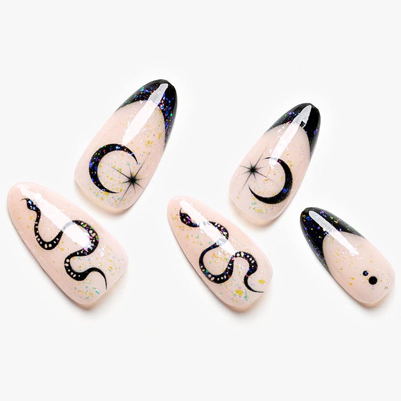 GLAMERMAID Nude White Press on Nails Medium Black French Tip, Gothic Short Fake Nails Almond, Acrylic False Nail Kits with Glitter Snake Design, Stick Glue on Nails Sets, Round Oval Nails for Women