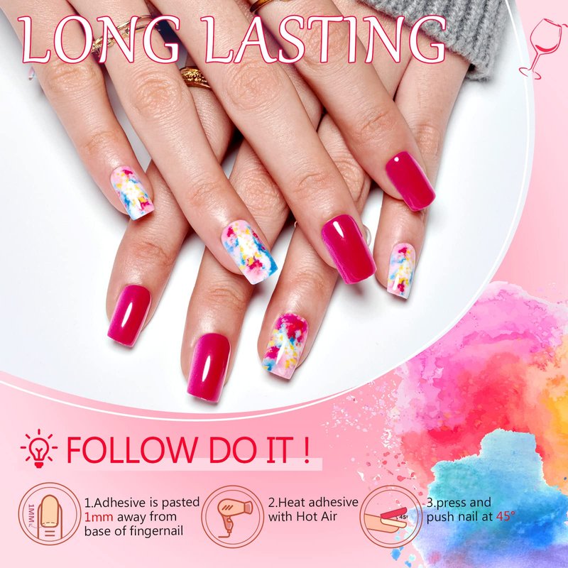 GLAMERMAID Press on Nails Medium Square, Red Watercolor Glue on Gel Nails, 24Pcs Short Square Reusable UV Finish Fake Nails Acrylic False Nails Manicure Kits for Women Gifts