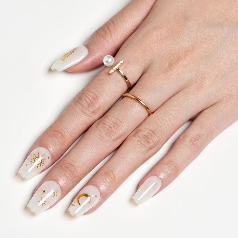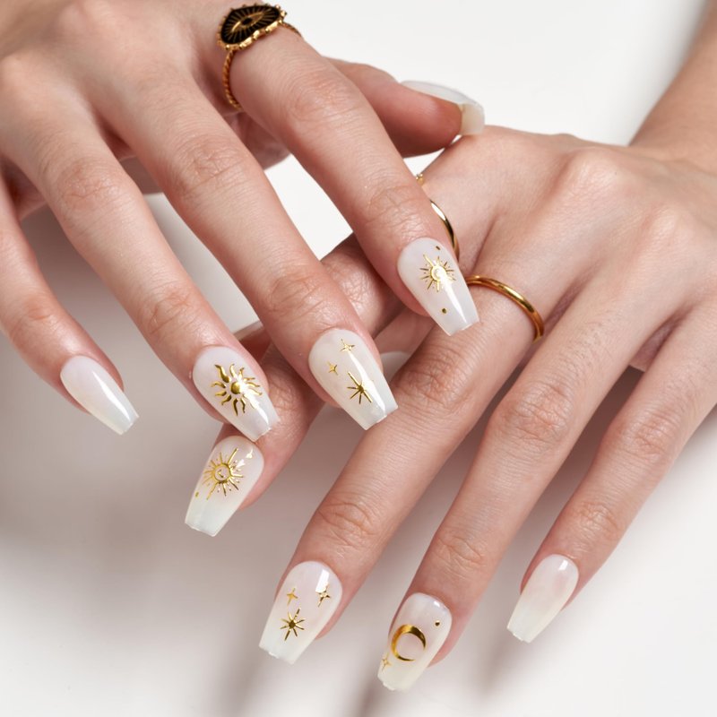 GLAMERMAID Press on Nails Short Coffin, Handmade Milky White Gel Nails Polish Glue on Nails with golden Sun, 24Pcs Reusable UV Finish Fake Nails Acrylic False Nails Manicure Kits for Women Gift