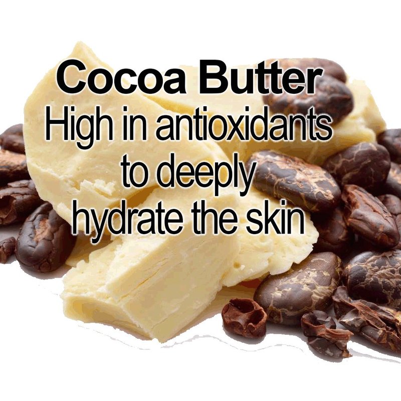 Organic Cocoa Butter: Noted to help reduce stretch marks and may diminish and heal scars. It deeply hydrates the skin, helping skin irritations such as eczema and dermatitis.
