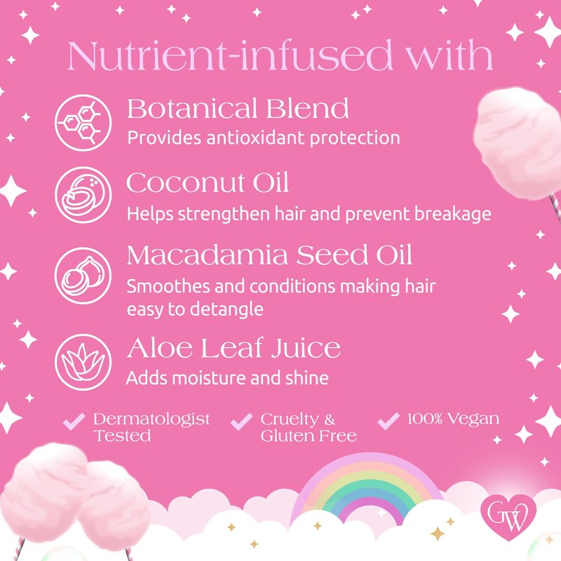- Pink, Cotton Candy Scented Hair Conditioner - Made with coconut and macadamia seed oils, our sulfate free conditioner helps to strengthen and smooth hair making it easy to detangle without breakage, while aloe leaf juice adds moisture and shine. Our magical Unicorn Conditioner makes hair as strong and shiny as a Unicorn’s mane!