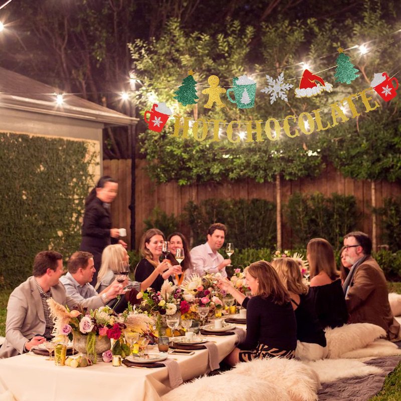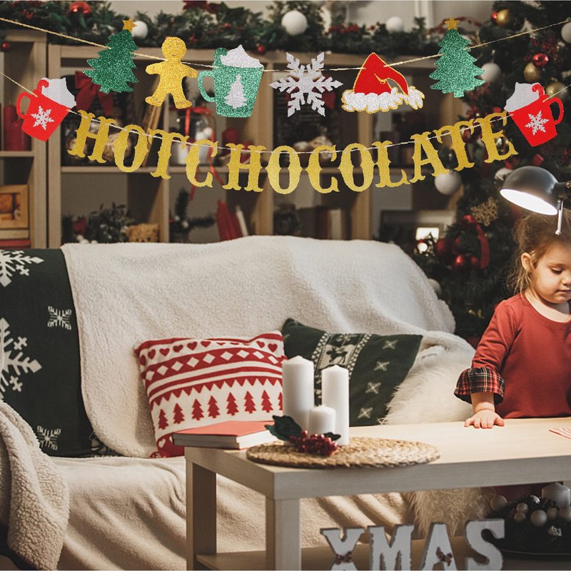 Glitter Christmas Hot Chocolate Banner with Christmas Tree Snowflake Santa Hat Hot Cocoa Bar Garland Banner for Wintertime Christmas Theme New Year Holiday Party Sign Decorations Supplies