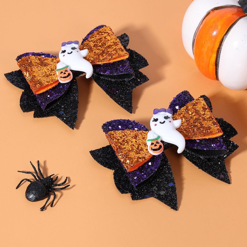 - Sparkly Halloween Theme Hair Bows- 2pc adorable Glitter Halloween Hair Bow Clips featuring glittery orange, black and purple festive colors embellished with scary but cute ghost,pumpkin holiday elements; super cute handmade glitter sparkling hair bow clips add a festive touch to any Halloween costumes,dress up,outfit.
