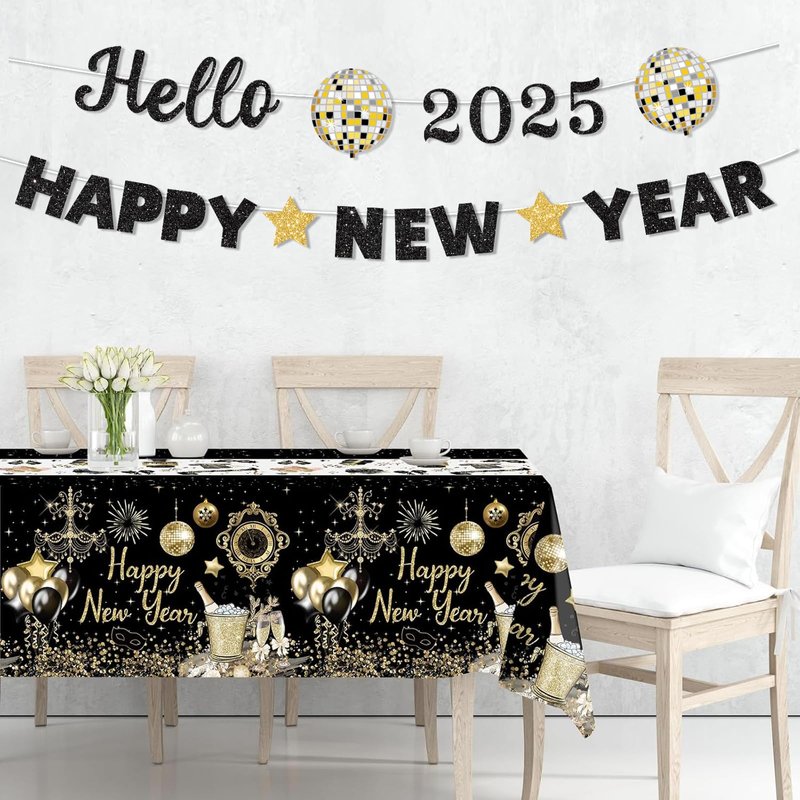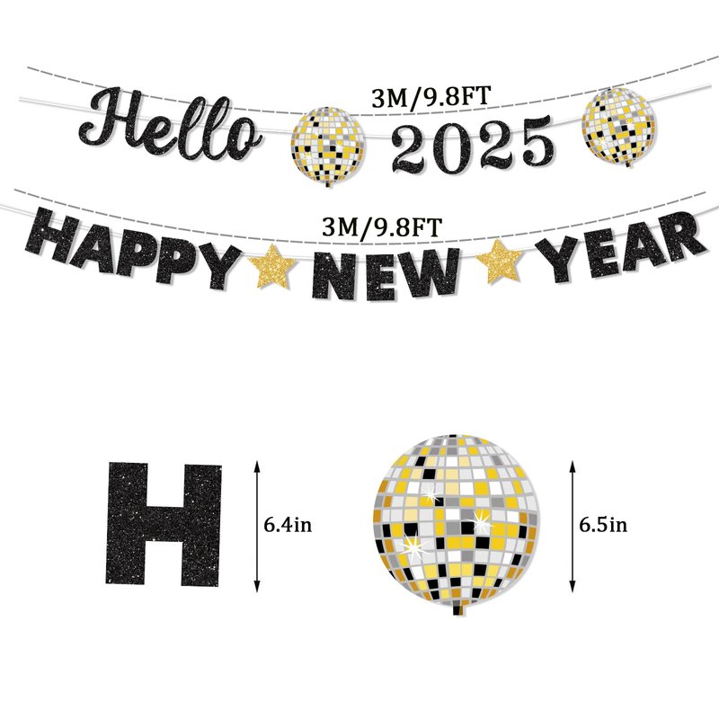 - 1... GLITTER black Happy new years eve party supplies 2025 Decorations: The black happy new year 2025 banner with star and Disco Ball is a perfect new year decorations. This large 9.8 feet new year banner will add a luxurious touch to your party, very suitable for 2025 New Year eve party. Adding a lot of fun to the New Year 2025 banner Home Holiday Decorations