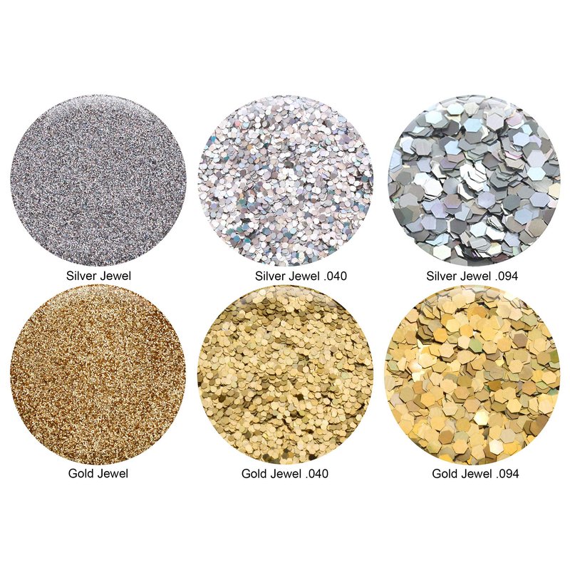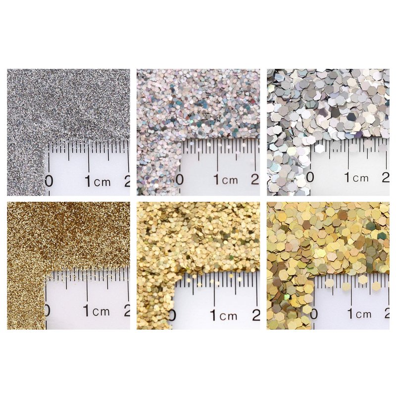 - GLITTER SIZE: This variety pack includes 3 different sizes of Silver and Gold glitter: .008" Fine Powder, .040" Hexagon, .094" Hexagon.