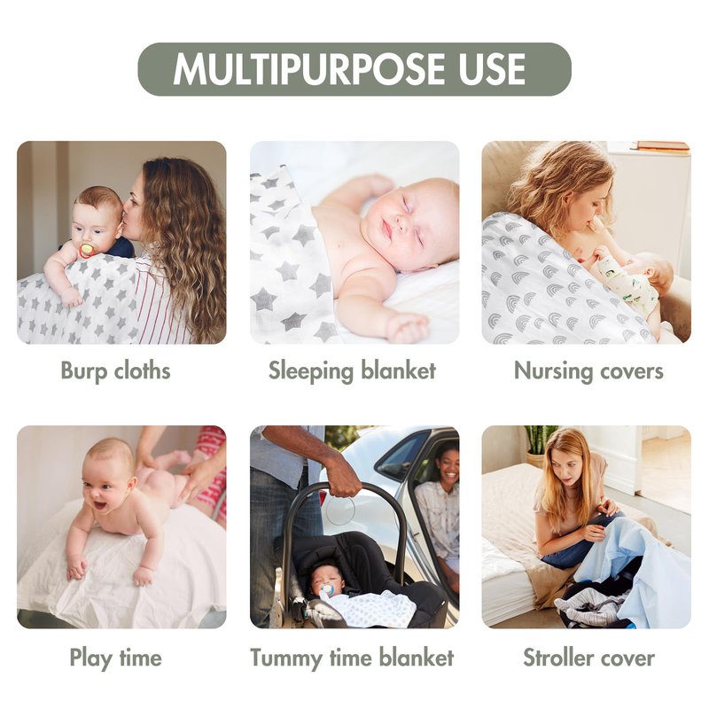 - ❤FOUR SEASONS GENERAL & VERSATILE- Due to their practical size (70 x 70 cm, 6 packs), baby blanket can be used for a variety of purposes, such as as receiving blanket, cuddle blanket, nursing cover, sunscreen for strollers, burp cloth, car seat cover, play mat, changing pad, mini crib sheet , cleaning the face, catching spit-up, Sun Shade, Picnic, or Tummy time Blanket and so on. And fast drying, so quickly ready for next use, provide even more day-to-day parent versatility.