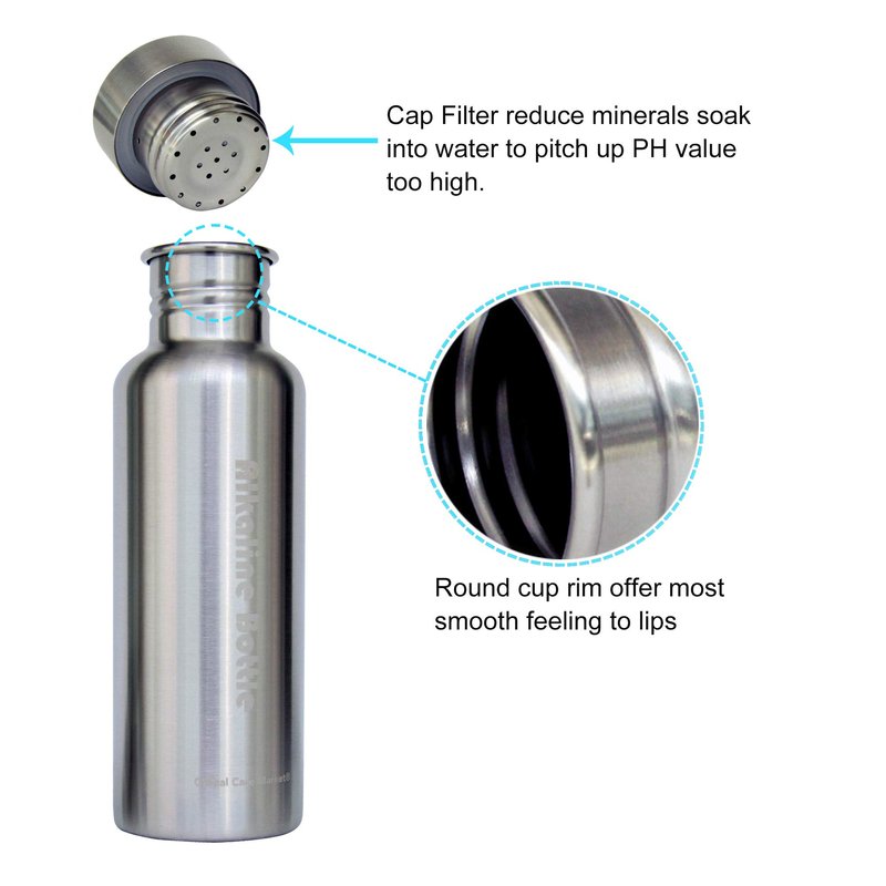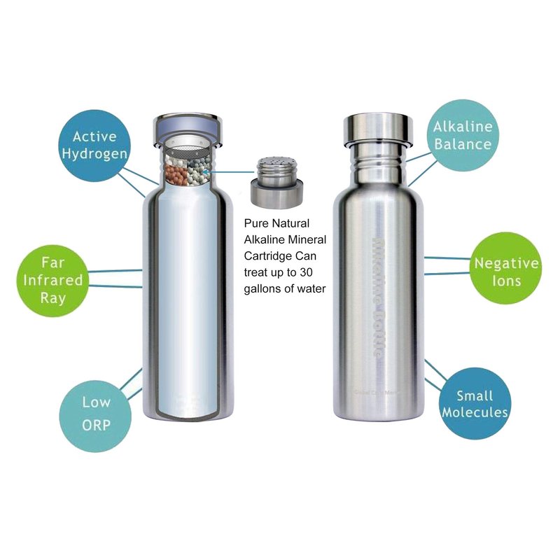 - The alkaline water bottle is made of stainless steel and contains a filter that uses all-natural stones and mineral elements to alkalize, purify and energize the water in the bottle.