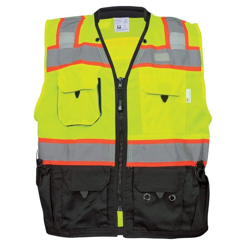 - High Visibility – This premium enhanced visibility surveyors safety vest features bright yellow/green material with contrasting orange trim, and 3M reflective lines on the front and back for enhanced visibility in low-light environments.
