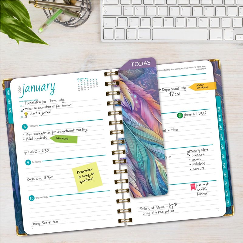 Global Printed Products HARDCOVER 2024 Planner: (November 2023 Through December 2024) 5.5"x8" Daily Weekly Monthly Planner Yearly Agenda Bookmark, Pocket Folder & Sticky Note Set (Pastel Peacock)