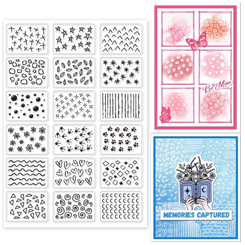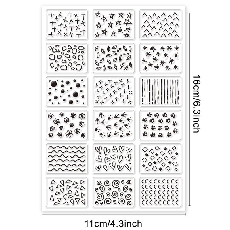 - Mini Marks Pattern Clear Stamps: Mini marks pattern clear stamps of 18 different stars, leaves, raindrops, flowers, love hearts crowns and paws patterns. Great for decorating your envelope, postcard, scrapbook, diary and holiday cards.