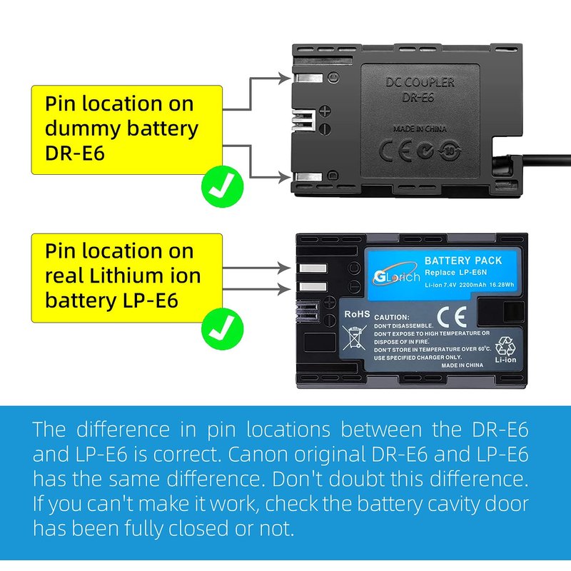- 【Compatible Models】Glorich ACK-E6 AC Power Adapter DR-E6 DC Coupler LP-E6 LP-E6N Dummy Battery Power Supply Kit Compatible with Cameras Canon EOS 5DS, 5DS R, 5D Mark II, 5D Mark III, 5D Mark IV, 60D, 60Da, 6D, 6D Mark II, 70D, 7D, 7D Mark II / 7D Mark 2, 80D, 90D, EOS R, EOS R5, EOS R6, with Fully-Decoded Smart Chip. DISCLAIMER: This product is NOT compatible with Canon EOS 5D which is an entirely different camera model and use different battery BP-511.