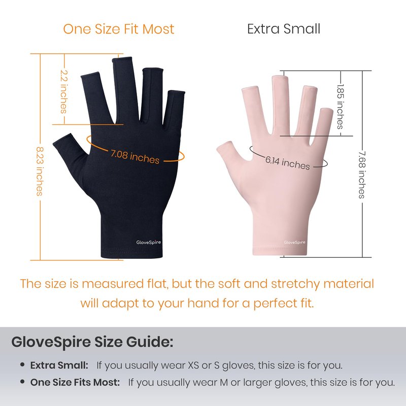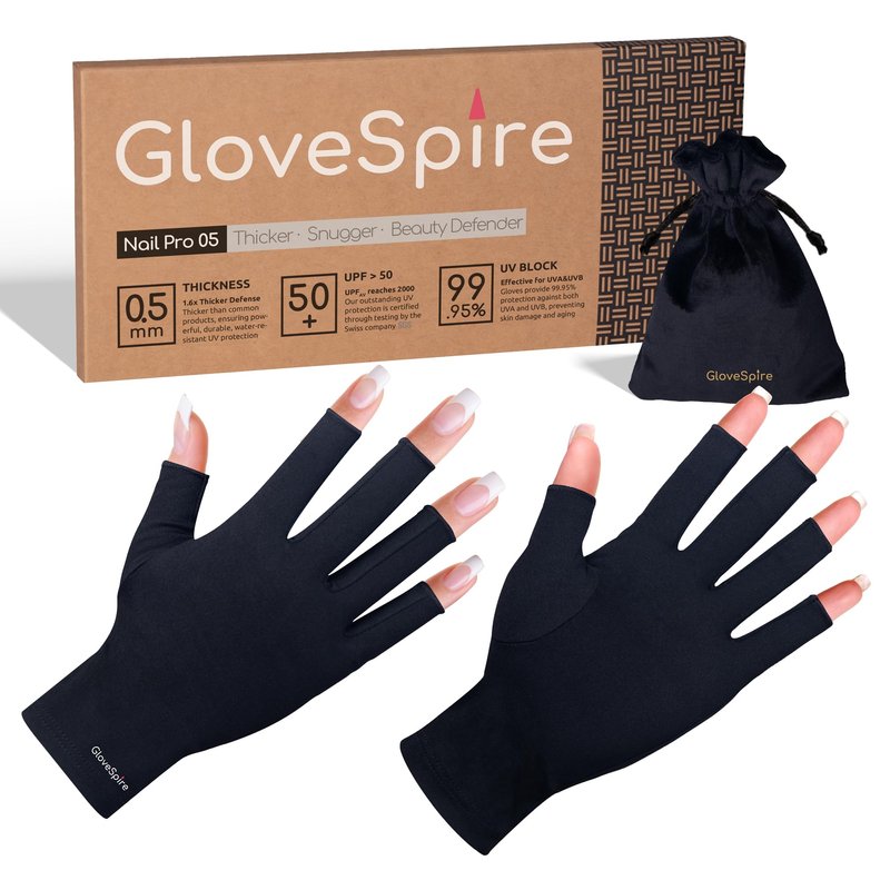 - WHY WEAR GLOVESPIRE DURING MANICURES? : Manicure lamps emit UV rays, including UVA and UVB, which can age and burn skin. GloveSpire uv nail gloves block 99.95% of UVA and UVB rays, offering high-performance protection. Available in two sizes for a comfortable fit, our uv gloves for gel nail lamp are durable, wash-resistant, and easy to carry, making them an essential for safe manicures.
