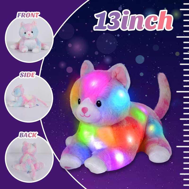 Glow Guards 13'' Lying Light up Cat Plush Toy Rainbow Kitty Soft Stuffed Bed Night Light Birthday for Toddler Kids