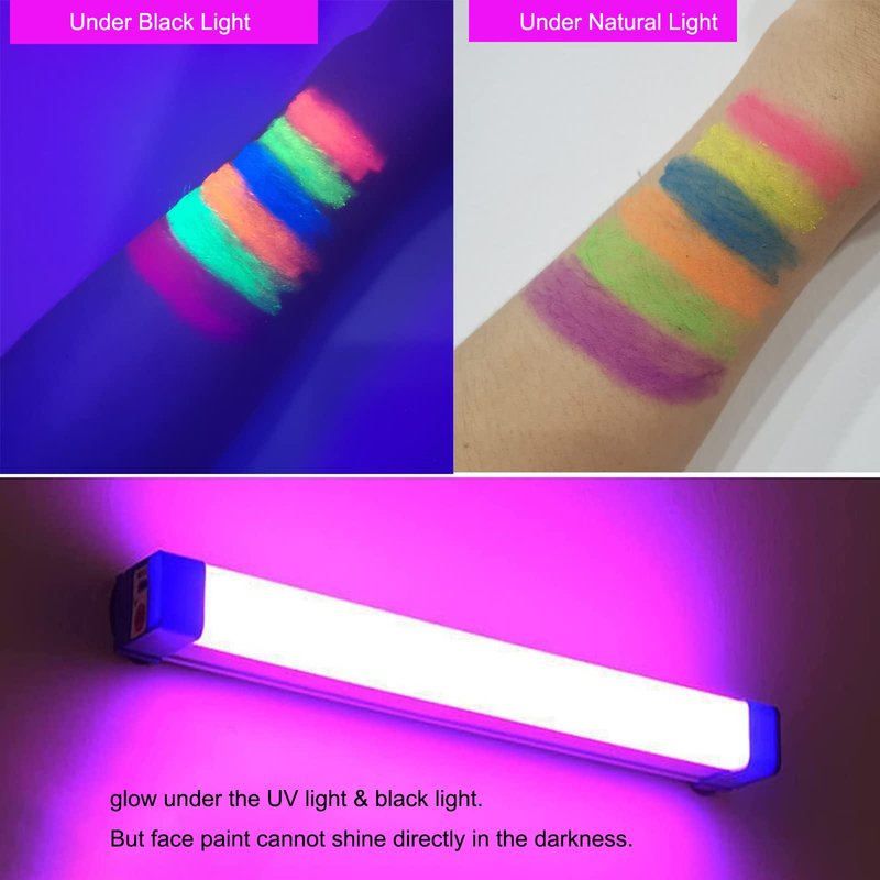- 【Glow In The Black Light Paint】:these glow in the dark face paint will glow brightly under ultraviolet light or black light.they will make you shine and dazzling in the dark. But face paint cannot glow in the dark directly.