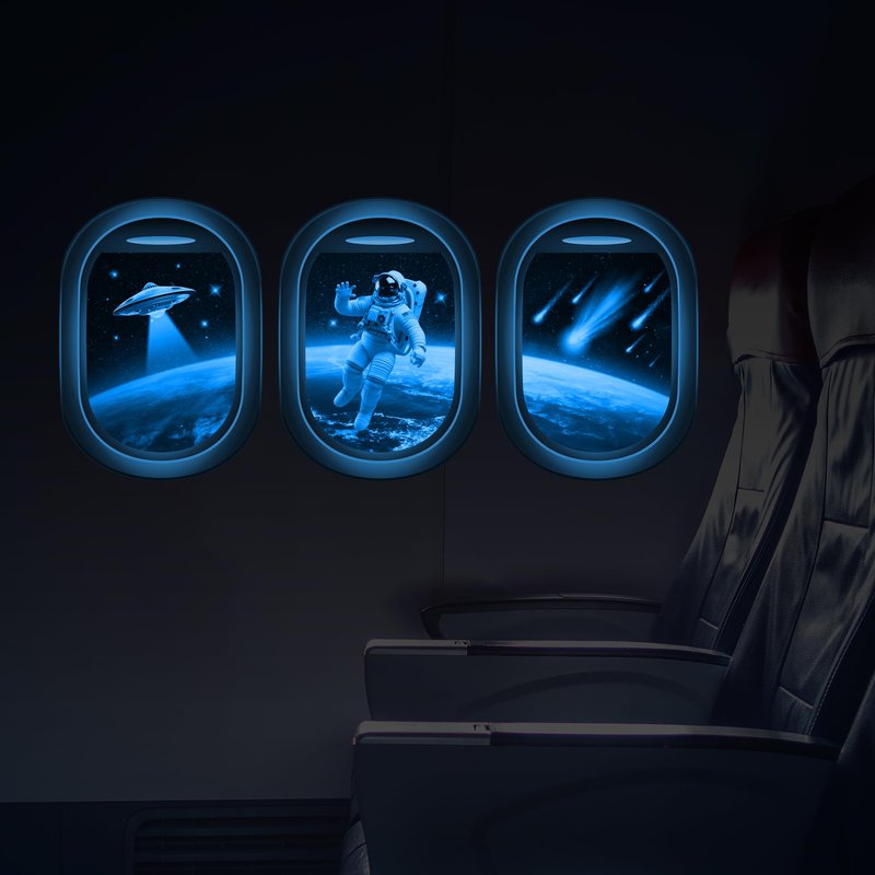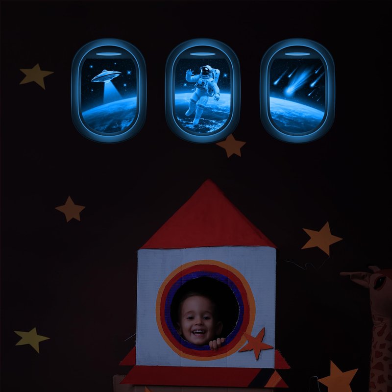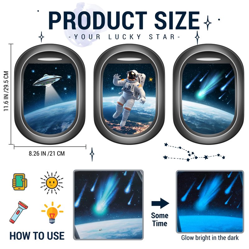 - 【Glow in the Dark Stars】A set of 3 pcs robmoda glow in the dark window shape outer space stickers. Each pc size is 8.26x11.6 inchs, scenes include earth, astronauts, meteors, spacecraft.